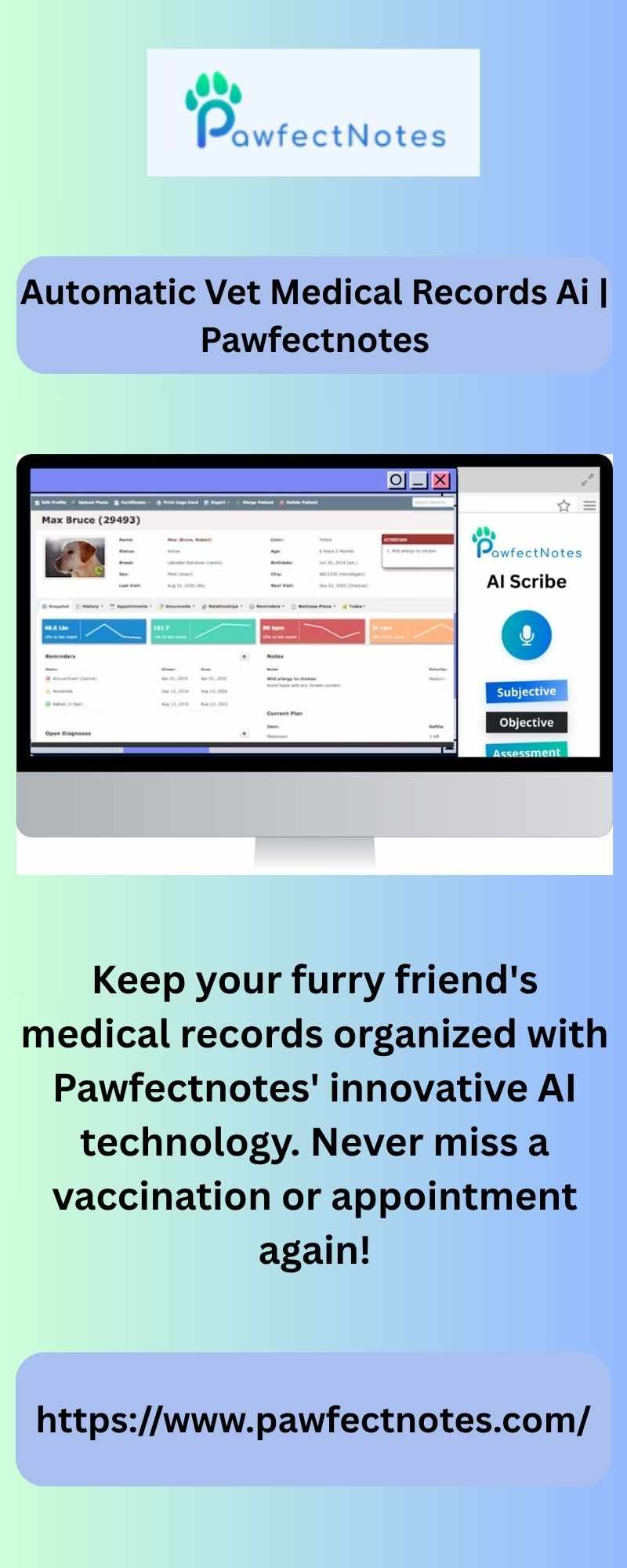 Keep your furry friend's medical records organized with Pawfectnotes' innovative AI technology. Never miss a vaccination or appointment again!